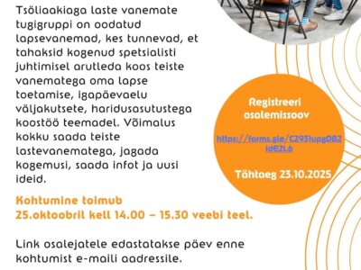 Oodatud on lapsevanemad, kes soovivad kogenud spetsialisti juhtimisel arutleda koos teiste vanematega oma lapse toetamise, igapäevaelu väljakutsete ning haridusasutustega koostöö teemadel. 📅 Kohtumine toimub 25. […]