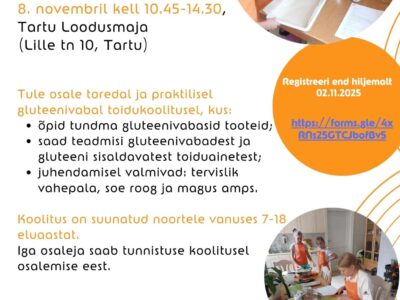 Ootame 7–18-aastaseid noori 8. novembril kell 10.45–14.30 Tartu Loodusmajja (Lille tn 10, Tartu) gluteenivabale toidukoolitusele. Koolitusel:🥣 õpid tundma gluteenivabasid tooteid ja saad teadmisi nii gluteenivabadest […]