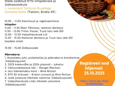 📅 Aeg: 1. november kell 10.30–17.00📍 Koht: Tallinna Puuetega Inimeste Koda (Endla 59, Tallinn)💰 Osalemine: tasuta (mitteliikmele lõunasöök 5.00 €) Alustame päeva kell 11.00 infopäevaga, […]