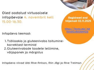 Kutsume kõiki lasteasutuste toitlustajaid 06.oktoobril toimuvale virtuaalsele infopäevale, kus räägime tsöliaakiast, gluteenivabast toitumisest ja ristsaastumise vältimisest. Infopäev toimub kell 17.00-18.30 Zoom keskkonnas. Ürituse viib läbi […]