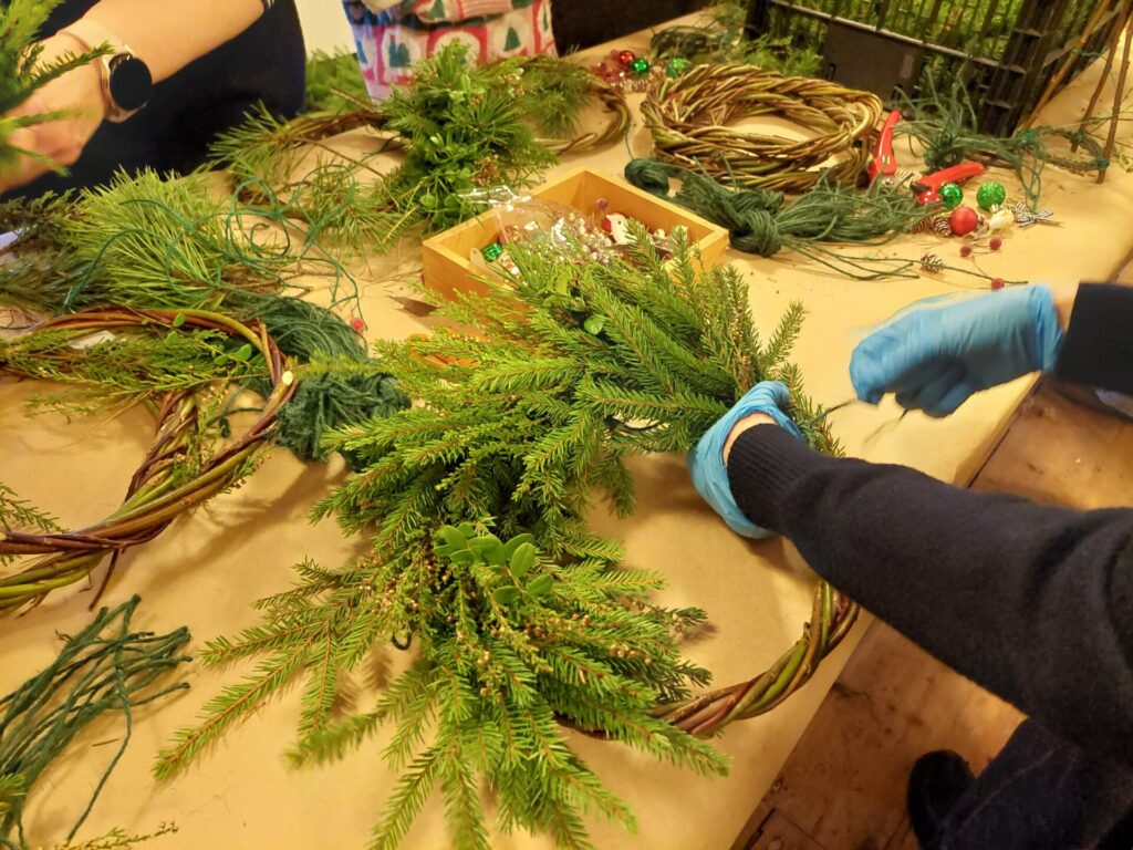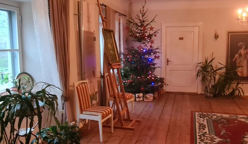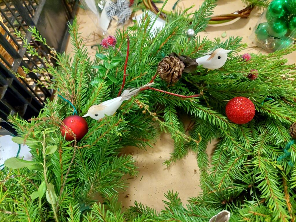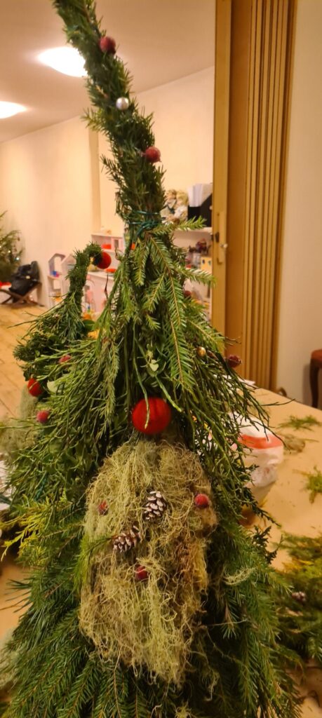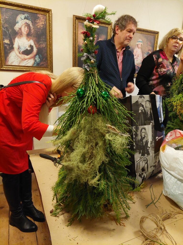 Kui esmane tutvus mõisaga tehtud, siirdusime töötuppa. Seal oli igal osalejal võimalus valmistada kas jõulupärg või päkapikk. Mõlemaks oli kasutada rohkelt looduslikku materjali: kuuseoksi, mustikaoksi, kanarbikku, sammalt jmt. Loomulikult ei puudunud ka kaunistusmaterjal: kuuseehted, linnukesed ja muu kaunistuskraam. Töötuba viis läbi Põrgupõhja talu.