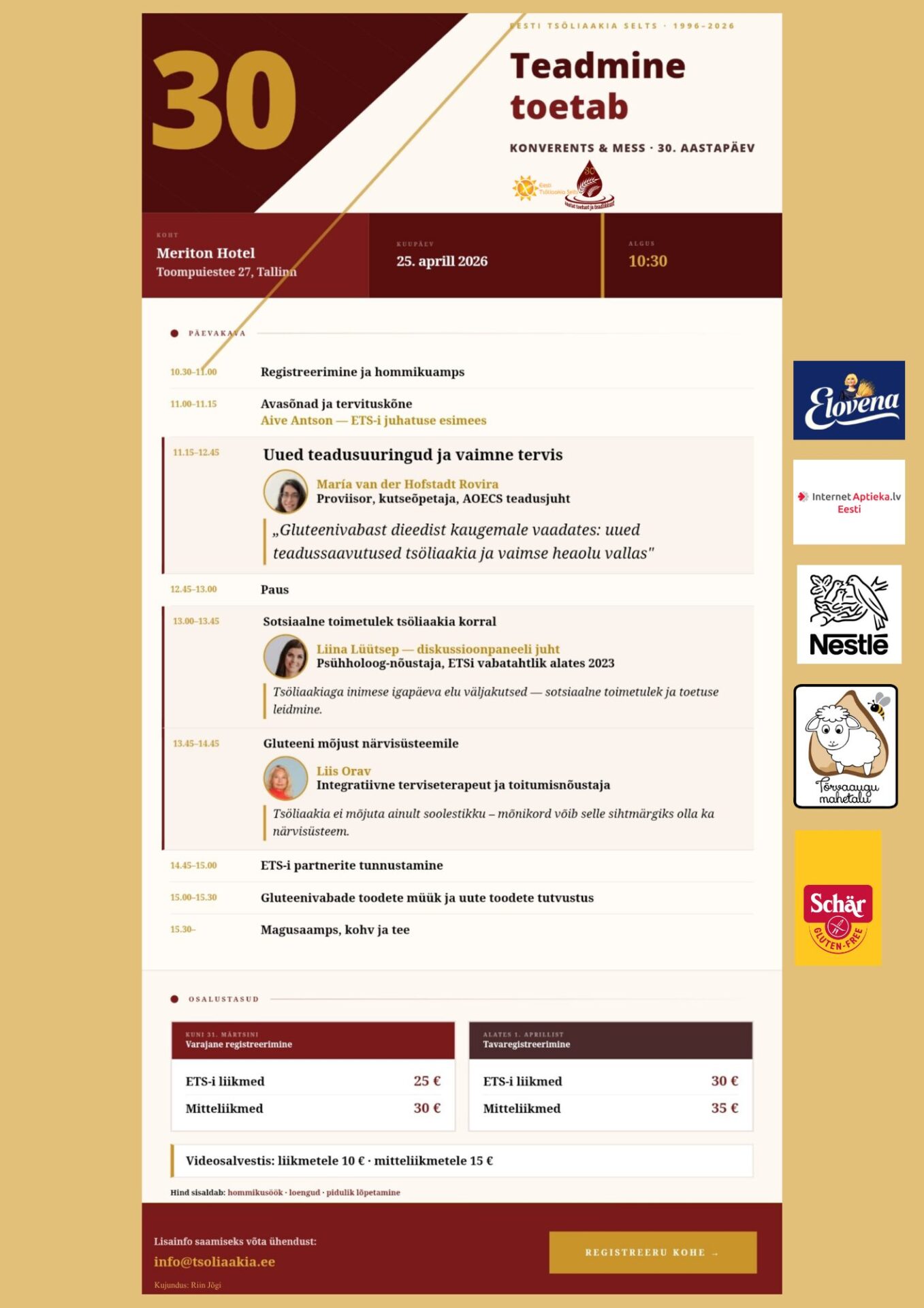 30 aasta jooksul oleme näinud, kuidas õige teave muudab tsöliaakiaga inimeste elu. Teadmine aitab teha paremaid valikuid, toimetulekut lihtsustada ja end toetuna tunda — selles peitub ka meie konverentsi teema “Teadmine toetab”.