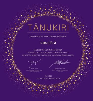 Meie kauaaegne vabatahtlik Riin Jõgi sai tunnustatud silmapaistva vabatahtliku kategoorias ja EPIK tunnustas teda nominendina. Riinil täitus kevadel 15. tegevusaasta seltsis ning selle aja jooksul on ta täitnud väga erinevaid ülesandeid – olnud nii juhatuses kui aktiivne vabatahtlik erinevates valdkondades. Praegu on Riin maaletoojate kontaktisik ning kodulehe ja sotsiaalmeedia haldur. Samuti on Riin aktiivselt panustanud nii vastla-, lihavõtte– kui jõulukataloogi tegemisse.